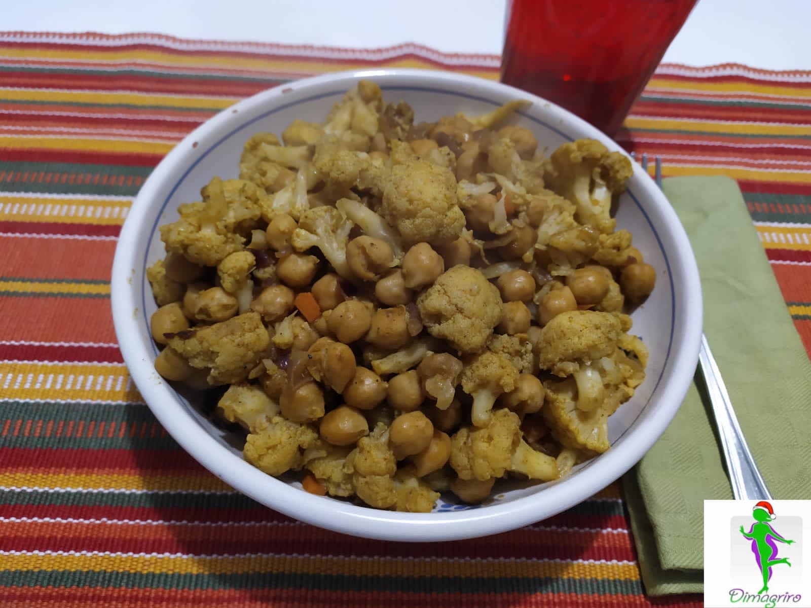In una padella grande mettere: carota e cipolla facendo soffriggere il tutto con l' evo aggiungere il cavolfiore ed il curry; fare insaporire andando aggiungendo l'acqua di cottura dei ceci a vostra disposizione.