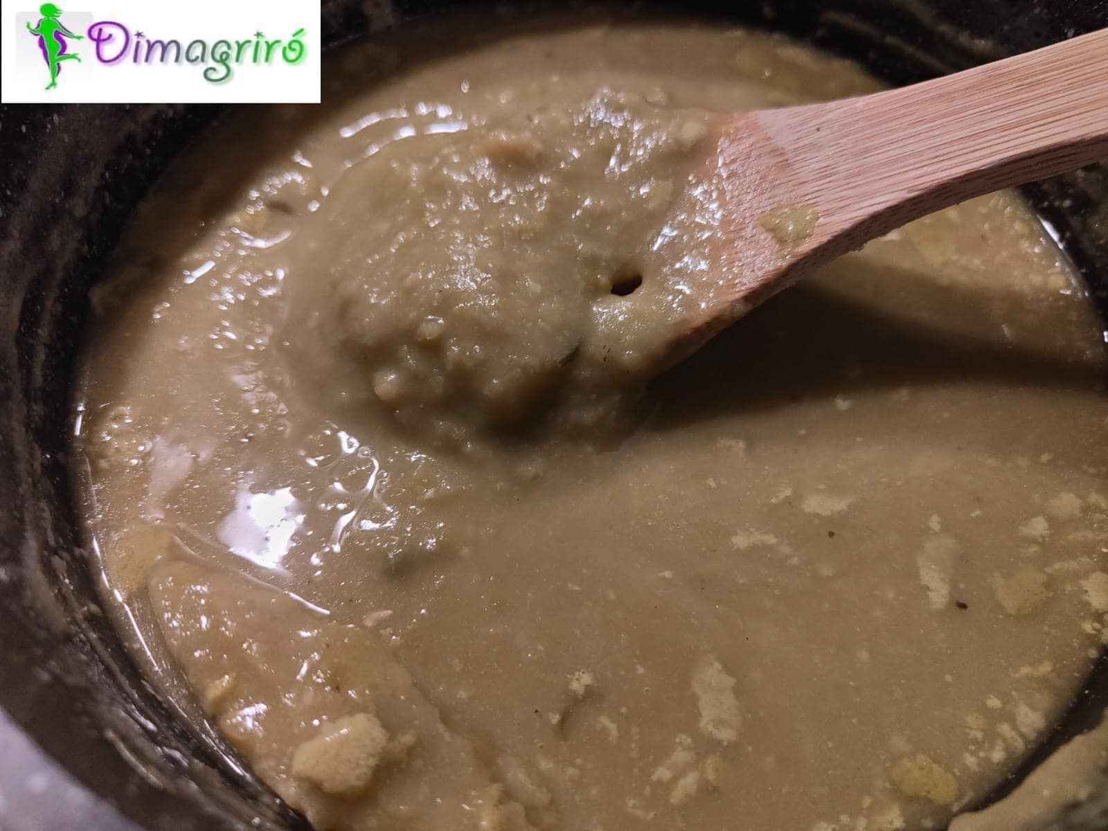 lasciare cuocere a fuoco basso finchè i piselli non inizieranno a disfarsi; (*)
