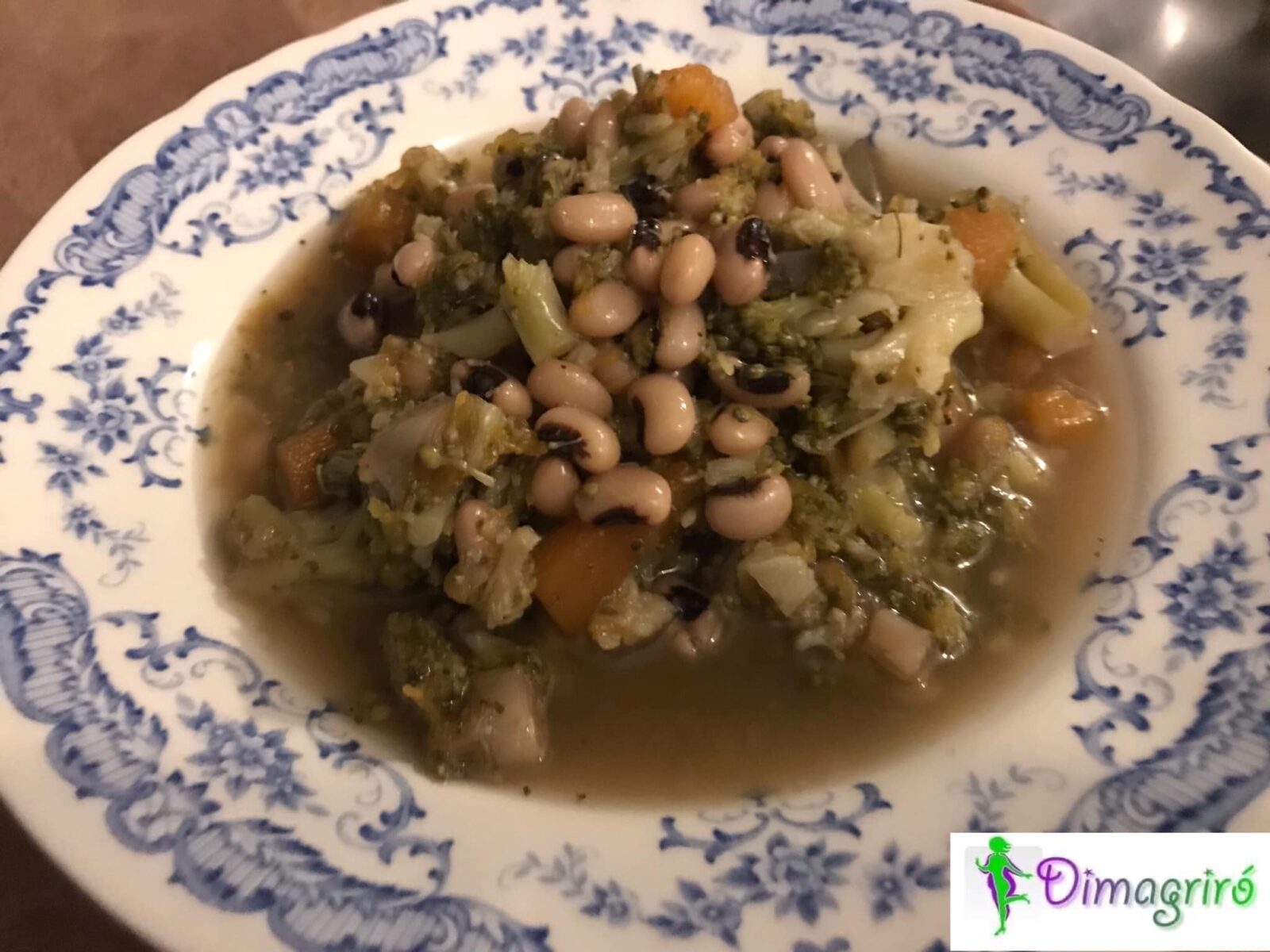 Fare cuocere il tutto per 5 minuti circa,aggiungere le cime del cavolfiore verde ed i fagioli dell'occhio.Ricoprire il tutto con acqua e fare cuocere per 30 minuti circa