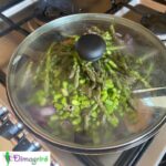 In una casseruola unire l'evo e la cipolla pulita e tagliata in piccole parti. Fare indaporire e fuoco basso per 5 minuti ed affiungere gli asparagi tagliati aggiungendo, sale e pepe nero
