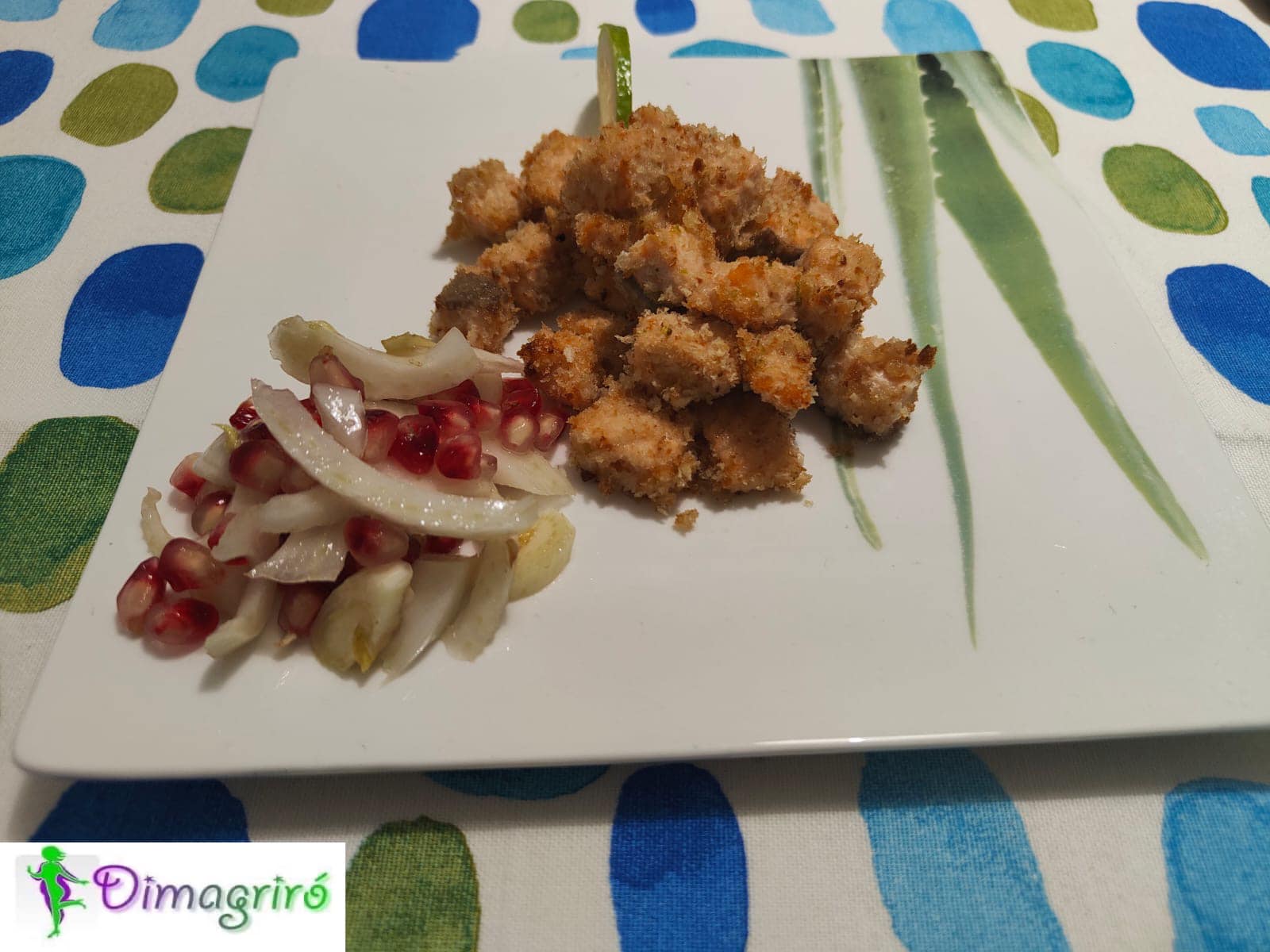 Prendere il salmone tagliato a dadini, ripassarlo nell'evo e nel pangrattato. Disporre i dadini così ottenuti su carta forno posta su leccarda