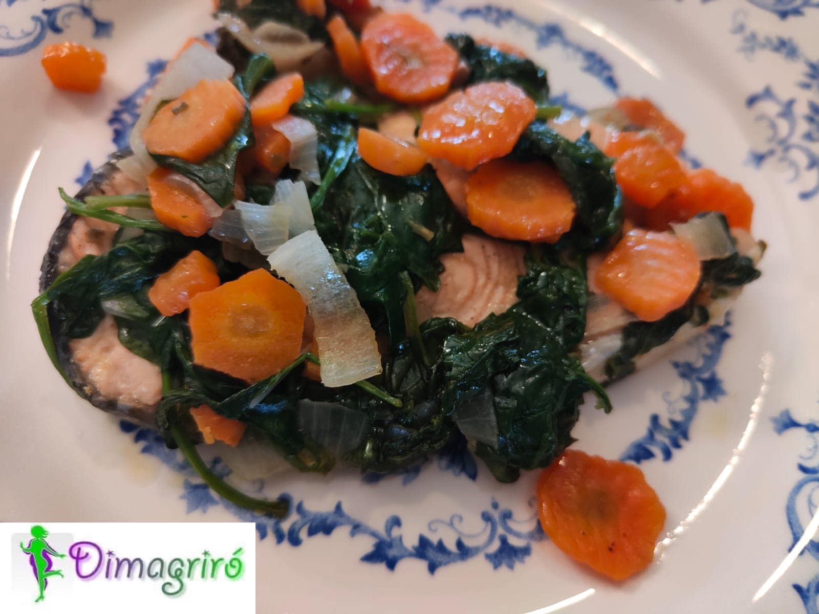In una caseruola unire scalogno ed evo, fare insaporire pochi istanti ed unire le fette di salmone. Fare cuocere per circa cinque minuti da ciascun lato le fette ed unire carote e spinaci