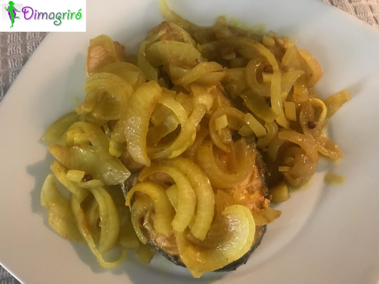 Aggiungere il curry ed il sale rosa, lasciando insaporire per pochi istanti, aggiungere il salmone fresco già sciacquato, e fare cuocere il tutto 10 minuti, a fuoco medio.