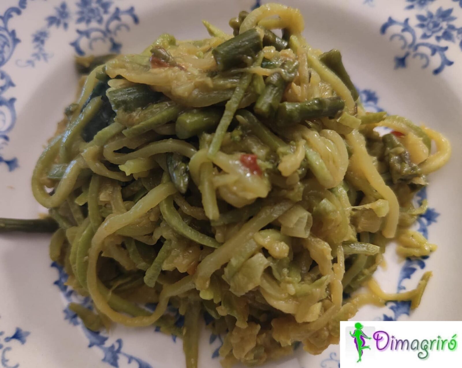 Pulire gli asparagi, tagliandoli in piccole parti (1-2 cm), ed unirli allo scalogno ed aggiungere anche gli spaghetti di zucchine. Fare cuocere il tutto a fuoco basso per 15 minuti (con coperchio), mescolando di tanto in tantoed unire le foglie dibasilico e le foglie di peperoncino quasi a cottura ultimata. Potrete utilizzare gli spagnetti così come sono oppure, unirli ad una pasta di legumi (piselli o fave) che completerà il vostro pasto.