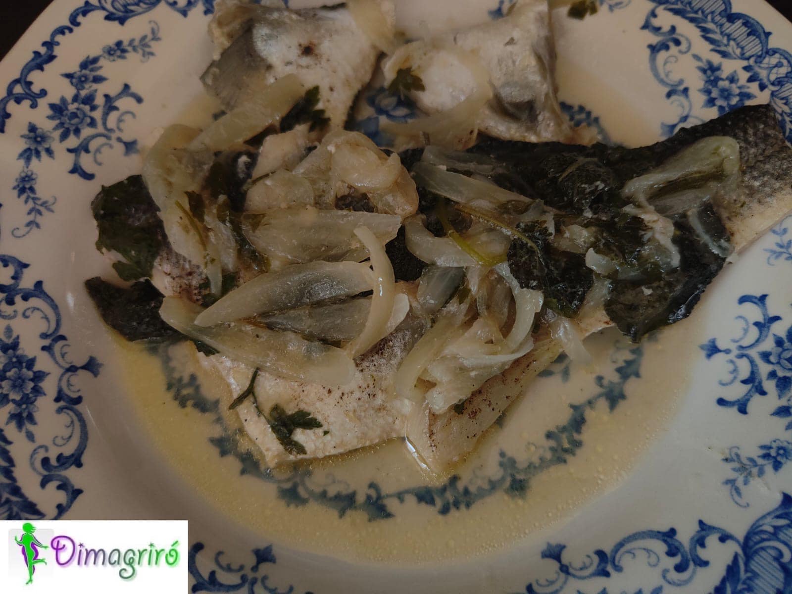 A questo punto, cercando di non rompere i filetti di spigola, girateli e ricopriteli con gli armoni e la cipolla. Aggiungete un altro mezzo bicchiere di acqua ed ultimate la cottura per 5 minuti a fuoco alto. (io non ho sfumato il pesce) chi lo volesse, protrebbe in questo momento della preparazione effettuare una sfumatura con del vino bianco o rosso, al posto del mezzo bicchiere di acqua