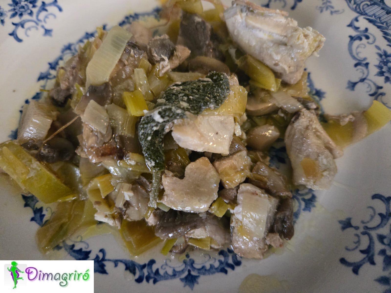 Aggiungere i tocchetti di pesce spada, i funfhi tagliati a fette e le foglie di salvia, aggiungere due bicchieri di acqua e fare cuocere il tutto